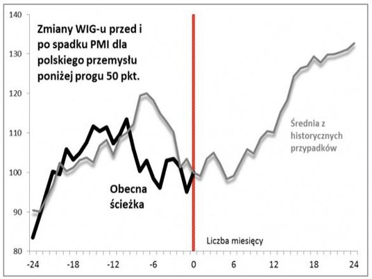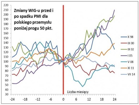 – Zobaczmy dokładnie, co działo się na GPW przed i po spadku PMI poniżej „magicznej" granicy 50 pkt. Sygnał ten tylko w niektórych przypadkach (2008, 2000) był zwiastunem głębokiego spowolnienia w całej gospodarce, w pozostałych (a tych była większość) kończyło się na przejściowej zadyszce – zauważa Tomasz Hońdo.