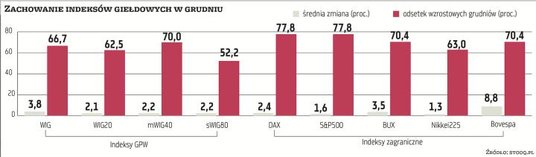 A jak wyglądamy pod tym kątem na tle zagranicy? Tutaj najlepiej porównać WIG. Indeks szerokiego rynku zmienia się w grudniu średnio o 3,8 proc. i jest pod tym względem lepszy od DAX, S&P 500, BUX i Nikkei225. Gorzej wypada tylko w porównaniu z brazylijską Bovespą. Gorzej wypadamy jednak pod względem trafności. Wynik WIG to 66,7 proc., a więc lepiej tylko od Nikkei225. Wygląda więc na to, że na rynkach zagranicznych anomalia zdarza się częściej, ale za to daje mniejszy zysk. Potwierdza to też średnia zwyżka indeksów podczas wzrostowych grudniów. Dla WIG jest to aż 7,4 proc., co jest gorszym wynikiem tylko od Bovespy.