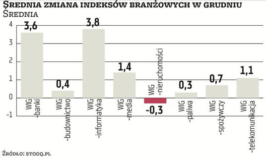 Z ciekawości sprawdziliśmy też, jak zachowują się indeksy sektorowe. Skoro bowiem ktoś nastawia się na grudniowe inwestycje, to warto wiedzieć, w jakich branżach szukać. Analizowaliśmy tylko te wskaźniki, które mają co najmniej 10-letnią historię. Intuicja sugerowałaby, że to spółki spożywcze będą mocną stroną rynku w końcówce roku (zwiększone zakupy na święta i sylwestra). Okazuje się jednak, że zdecydowanie najlepiej wypadają firmy z branży IT oraz banki. Średnia zmiana WIG-informatyka to aż 3,8 proc., a WIG-banki 3,6 proc. Warto dodać, że wskaźniki te mają też niezłą trafność, odpowiednio 63,2 proc. oraz 73,7 proc. Unikać lepiej sektora nieruchomości, bowiem branżowy wskaźnik ma dla grudnia ujemną średnią -0,3 proc.