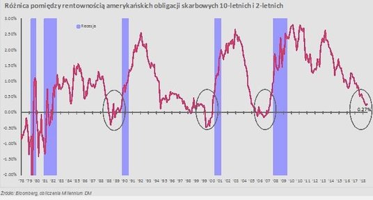 – Jednym z bardziej interesujących zjawisk, które w ostatnich tygodniach przykuwa uwagę inwestorów na całym świecie, jest wykres obrazujący różnice pomiędzy rentownością 10- i 2-letnich amerykańskich obligacji skarbowych. Przez wielu uczestników rynku wskaźnik ten jest uważany za bardzo dobre narzędzie do określenia, w jakim cyklu gospodarczym obecnie się znajdujemy, a co najważniejsze – kiedy możemy spodziewać się jego odwrócenia – mówi Sebastian Siemiątkowski z departamentu analiz Millennium DM.