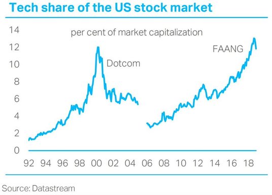 Holger Zschaepitz z „Die Welt" zaprezentował wykresy spółek technologicznych z amerykańskiego rynku akcji – przedstawił ich kapitalizację jako procent kapitalizacji całego rynku. Dziennikarz porównał „dwie giełdowe epoki".