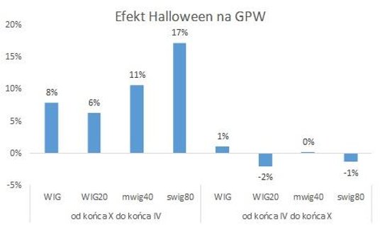 Na wielu giełdach udowodniono, że stopy zwrotu z rynku akcji w okresie listopad-kwiecień są przeciętnie wyższe niż stopy zwrotu w okresie maj-październik. To tzw. efekt Halloween, który mówi nam, że lepiej robić giełdowe zakupy właśnie w okolicach tego wywodzącego się z USA zwyczaju, czyli na przełomie października i listopada.