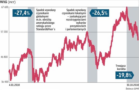 Tąpnięcie z lat 2011–2012 trwało niecałe 6 miesięcy i było w dużej mierze efektem mocnej korekty na amerykańskim rynku akcji, której zapalnikiem okazało się ścięcie amerykańskiego ratingu przez agencję S&P. Z kolei załamanie z 2015 r., które przeciągnęło się do ponad ośmiu miesięcy, było wywołane czynnikami lokalnymi. Obecna słabość GPW to mieszanka czynników zewnętrznych w postaci słabości zagranicznych giełd i lokalnych wynikających z odpływu kapitału z krajowych TFI.