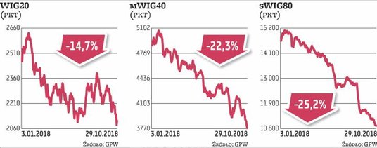 Jesień miała wyglądać inaczej na warszawskiej giełdzie. Przeważały opinie, że dla małych i średnich spółek, które są w bessie od miesięcy, impulsem do zmiany trendu będą lepsze wyniki kwartalne, a także wezwania inwestorów na akcje. Zamiast rosnącego popytu na akcje „misiów", znacznie wzrosła podaż ich akcji z TFI, co jeszcze mocniej nakręciło spadki mWIG40 i sWIG80. Z kolei dla dużych spółek impulsem miało być przesunięcie Polski z grona rynków wschodzących do rozwiniętych według klasyfikacji FTSE Russell. Co prawda w poniedziałek WIG20 odrabiał znaczną część strat z bardzo trudnej piątkowej sesji, jednak pod koniec zeszłego tygodnia zaliczył nowy w tym roku dołek i pierwszy raz od lutego 2017 r. znalazł się poniżej 2100 pkt.