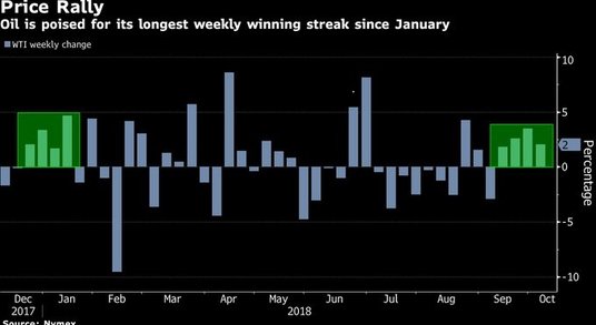 Bloomberg zwrócił ostatnio uwagę na najdłuższą serię tygodniowych zwyżek na rynku ropy naftowej WTI (West Texas Intermediate) od stycznia.