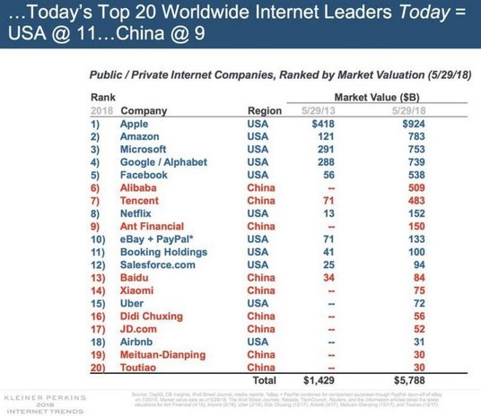 Po pierwsze, obserwujemy coraz większe znaczenie chińskich firm w tym obszarze. Do 2014 r. Chiny miały tylko dwóch przedstawicieli wśród 20 największych przedsiębiorstw internetowych na świecie. Obecnie jest ich już aż dziewięć. Najważniejsze z nich to oczywiście Alibaba – gigant e-commerce notowany na NYSE, a także Tencent Holdings, zajmujący się m.in. portalami społecznościowymi, grami online czy systemami płatności. Inne chińskie technologiczne olbrzymy to choćby Ant Financial (fintech) czy Baidu (twórca m.in. najpopularniejszej wyszukiwarki internetowej w Państwie Środka).