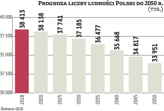 Jak wynika z prognoz Głównego Urzędu Statystycznego, liczba ludności w Polsce będzie systematycznie spadać i za dekadę ma wynieść ok. 37,43 mln. GUS w swojej kolejnej prognozie, dla gmin na lata 2017–2030, podkreśla dodatkowo, że w 2016 r. odsetek osób starszych (w wieku 65 i więcej lat) był wyższy niż 20 proc. w zaledwie 4 proc. gmin, z kolei w 2030 r. gminy z udziałem osób starszych przekraczającym 20 proc. będą stanowiły już prawie dwie trzecie wszystkich gmin w Polsce. Dodatkowo wyniki prognozy GUS wskazują, że w 2030 r. liczba urodzeń będzie większa od liczby zgonów jedynie w 599 spośród 2478 gmin.