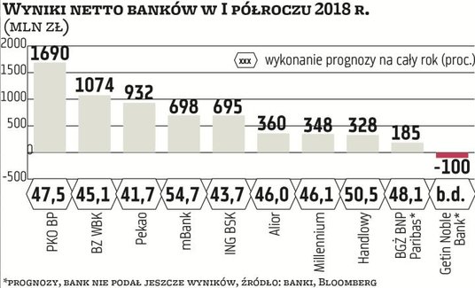Zdarzenie jednorazowe w dużym stopniu pozytywnie wpłynęło na wyniki mBanku – chodzi o sprzedaż części spółki mFinanse, która dała w I kwartale dodatkowo 177 mln zł zysku netto. Po I półroczu zysk netto mBanku wyniósł 698 mln zł (czyli o 42 proc. więcej niż rok temu, bez tej transakcji zysk wzrósłby o 6 proc.). Dlatego ten bank po I półroczu ma wykonane aż 55 proc. prognozy zysku netto na cały rok (zakłada 1,28 mld zł). Po korekcie o transakcję wykonanie wynosi 41 proc. i jest jednym z najniższych w sektorze. W większości banków wynosi między 44 proc. a 51 proc. –słabsze I półrocze to efekt obciążenia I kwartału znaczną częścią składki na BFG.