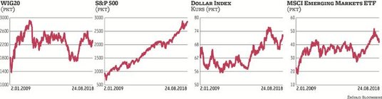 Nadal niewyjaśniona pozostaje sytuacja rynków wschodzących. MSCI Emerging Markets ETF od dołka z 15 sierpnia wzrósł do minionej środy o ponad 4 proc., powracając powyżej 43 punktów, jednak w czwartek pod wpływem umacniającego się dolara znów znalazł się poniżej tego poziomu. Notowania Shanghai Composite ustabilizowały się nieco powyżej 2700 punktów, ale kolejna runda w wymianie „celnych" ciosów może tę równowagę w każdej chwili zaburzyć.