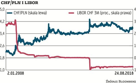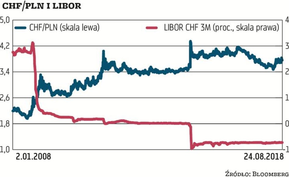 Rok 2017 przyniósł ulgę frankowiczom – kurs szwajcarskiej waluty do złotego obniżył się wtedy o blisko 14 proc., ale z początkiem bieżącego roku znów zaczął rosnąć i obecnie wynosi 3,76 zł. Chociaż kwietniowa korekta sprowadziła go chwilowo do 3,47 zł, czyli najniższego poziomu od trzech lat, nieco niższego niż poprzedzającego tzw. czarny czwartek (15 stycznia 2015 r.), kiedy Szwajcarski Bank Narodowy uwolnił swoją walutę i kurs wystrzelił do ponad 4 zł.