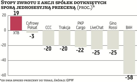 Wśród spółek, których notowania nie odrobiły jeszcze strat po przecenie, są m.in. Cyfrowy Polsat, CCC, Trakcja, PKP Cargo, LiveChat i Gino Rossi. Analitycy ostatnio pozytywnie wypowiadali się na temat PKP Cargo, które zwiększa przewozy i liczy na przyśpieszenie wzrostu w kolejnych kwartałach. Cyfrowy Polsat jest w dobrej sytuacji fundamentalnej, a jego notowaniom zaszkodził czynnik techniczny (sprzedaż akcji przez jednego z prywatnych akcjonariuszy mniejszościowych). LiveChat zdaniem ekspertów jest w momencie, kiedy nie widać jeszcze efektów pracy nad poprawą jakości produktów i poszerzeniem oferty.