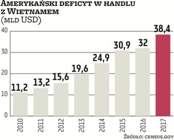 Dane wietnamskiego Ministerstwa Planowania Gospodarczego i Rozwoju mówią, że napływ bezpośrednich inwestycji zagranicznych wzrósł w pierwszej połowie roku o 8,4 proc. W zeszłym roku było on najwyższy od dziesięciu lat i wszystko wskazuje, że 2018 r. okaże się jeszcze lepszy. To przyczynia się do szybkiego tempa wzrostu gospodarczego Wietnamu. W pierwszym kwartale wyniosło ono aż 7,4 proc. Kraj przeżywa boom eksportowy i wysyła coraz więcej dóbr do USA. W 2017 r. amerykański deficyt w handlu z Wietnamem wynosił 38 mld USD i był prawie trzykrotnie większy niż w 2011 r.