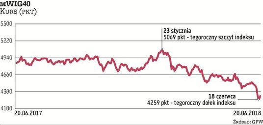 W długim terminie sytuacja jest odmienna, a na uwagę zasługują takie poziomy jak 4068 oraz 3946, na których ma prawo dojść do kluczowej konfrontacji popytu i podaży. Wprawdzie bieżące notowania indeksu zachęcają do aprecjacji, jednak z długoterminowego punktu widzenia sygnały płynące z analizy technicznej są na korzyść dalszych spadków i pogłębiania tegorocznych dołków. Słabość pierwszej i trzeciej linii GPW negatywnie wpływa na postrzeganie średniaków i jeżeli ma się ono poprawić na kolejne miesiące, to ceny zamknięcia na wykresie tygodniowym musiałyby wrócić nad pułap 4750 pkt.