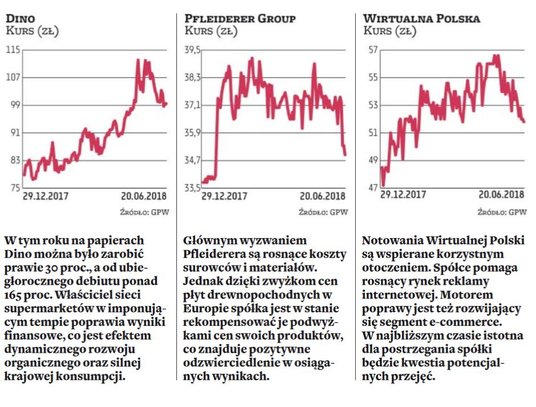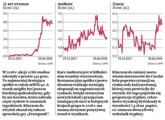Najwięcej powodów do zadowolenia mają posiadacze akcji 11 bit studios. Tylko w tym roku na papierach producenta gier można było zarobić prawie 140 proc. Wzmożony popyt to efekt premiery „Frostpunka", która odbyła się w II połowie kwietnia. Od tego momentu pojawiło się kilka pozytywnych rekomendacji dla akcji firmy, przewidujących dalsze zwyżki. – Duży dotychczasowy sukces „Frostpunka" potwierdza, że „This War of Mine" nie był przypadkiem, a filozofia spółki ma istotne przełożenie na wyniki. Uważamy, że percepcja spółki może się istotnie polepszyć, z uwagi na umocnienie pozycji wśród topowych deweloperów gier na świecie. Na podstawie dobrych recenzji „Frostpunka" (i dotychczasowych dokonań spółki) spodziewamy się dalszej monetyzacji gry w nadchodzących latach. Ponadto, rosnąca społeczność graczy spółki stanowi potencjał sprzedaży przyszłych gier – uważa Michał Czerwiński, analityk DM BZ WBK. Liczy, że sukces sprzedaży gry przełoży się na skokową poprawę przychodów i zysków oraz znacząco zwiększy zasoby gotówkowe spółki.