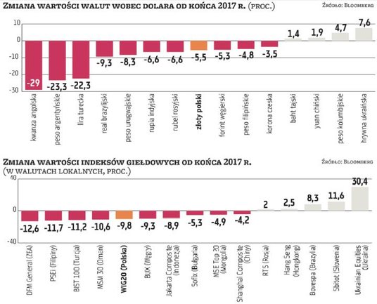Złoty nie znajduje się nawet w dziesiątce najgorszych w tym roku walut z rynków wschodzących. Jego tegoroczna deprecjacja jest podobna jak forinta węgierskiego (5,3 proc.), a mniejsza niż rupii indyjskiej (6,6 proc.), reala brazylijskiego (9,3 proc.), nie mówiąc już o przechodzącej załamanie lirze tureckiej (22,3 proc.), peso argentyńskim (23,3 proc.) czy boliwarze wenezuelskim (99,9 proc.).