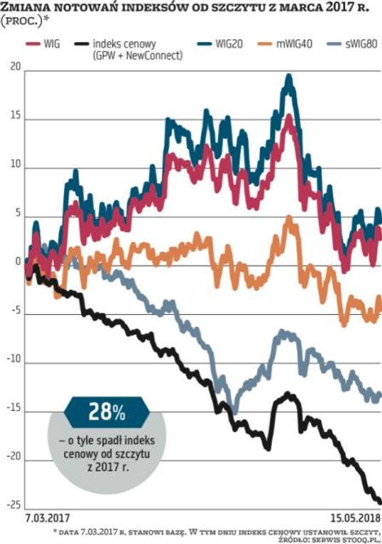 Na tytułowy wniosek wskazuje analiza trochę zapomnianego indeksu cenowego, który obejmuje wszystkie spółki z GPW i NewConnect i nadaje im równe wagi. Okazuje się, że od szczytu z marca 2017 r. stracił on już 28 proc., a więc przekroczył granicę bessy. Na wykresie dominuje trend spadkowy i trudno doszukać się tam sygnałów zakończenia tej tendencji.