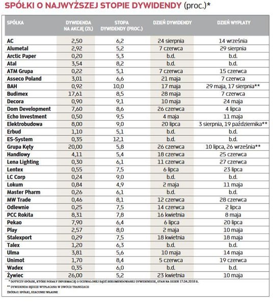 Najwyższe stopy dywidendy oferują mniejsze firmy, ale wśród tych z indeksu WIG20 też można znaleźć kilka dywidendowych perełek. – Myślę, że poza Handlowym i Pekao oraz PZU, które w tym roku będą hojne dla swoich akcjonariuszy, dywidendy wśród dużych spółek mogą być mniej efektowne niż w ubiegłym roku. Mniejsze firmy też nie mogą zaliczyć generalnie 2017 r. do udanych, dlatego dywidendowych okazji szukałbym wśród średniaków – ocenia Marcin Materna, dyrektor departamentu analiz Millennium DM.