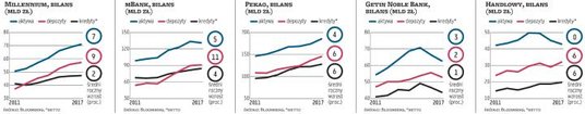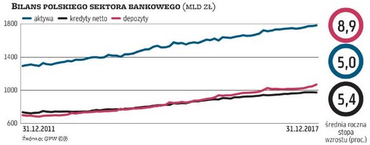 Pod względem tempa rozwoju, mierzonego nominalnym wzrostem wartości aktywów, największymi zwycięzcami okazały się PKO BP i BZ WBK, które zwiększyły bilans odpowiednio o 106 mld zł i 93 mld zł. Sporym wzrostem wykazały się również ING Bank Śląski i Alior, które zwiększyły aktywa o 56 mld zł i 54 mld zł, a także BGŻ BNP Paribas, który urósł o 39 mldzl. W miejscu tkwi Handlowy, z niemal identyczną wartością aktywów jak na koniec 2011 r., oraz Getin Noble Bank, który od 2016 r. już nie rośnie, a wręcz kurczy się i jego bilans jest o tylko 8 mld zł większy niż sześć lat wcześniej. Łącznie aktywa całego sektora bankowego wzrosły w tym okresie o 487 mld zł, do 1,78 bln zł.