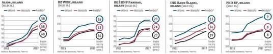 W ujęciu wzrostu procentowego absolutnym liderem okazał się Alior, który zwiększył bilans aż o 348 proc., do prawie 70 mld zł. Bardzo mocno urosły także BZ WBK (155 proc.), BGŻ BNP Paribas (118 proc.) ING Bank Śląski (81 proc.) oraz PKO BP (56 proc.). Słabo wypadły Getin i Handlowy a przeciętnie Millennium, mBank i Pekao, których średnioroczne tempo wzrostu aktywów w tym czasie wyniosło odpowiednio o 7 proc., 5 proc. i 4 proc. Cały sektor przez sześć lat urósł o 38 proc. a średniorocznie o 6 proc.