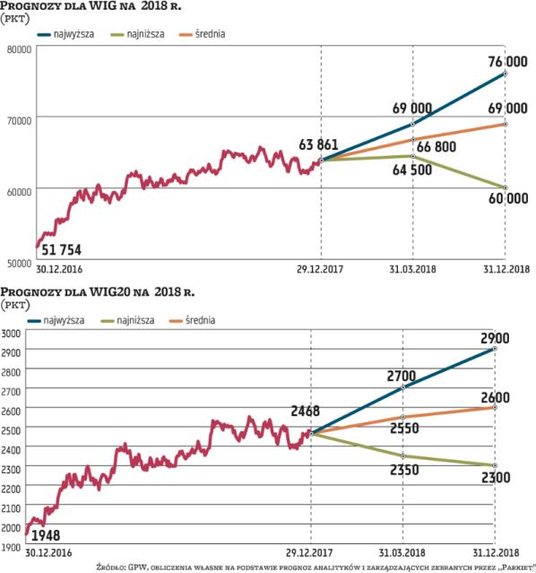 Większość ekspertów, z którymi rozmawialiśmy, przewiduje, że na koniec 2018 r. WIG, oscylujący na ostatnich sesjach wokół 64 tys. pkt, poprawi swoje notowania. Prognozy wahają się od 60 tys. do 76 tys. przy średniej na poziomie 69 tys. pkt. To oznacza, że szeroki rynek akcji może urosnąć o 8 proc. Może więc wreszcie pobić rekord wszech czasów z 2007 roku (67 568 pkt w cenach zamknięcia). – Jednym z głównych byczych impulsów dla rynku akcji w Polsce powinna być poprawa dynamiki inwestycji w krajowej gospodarce. Są prognozy, że dynamika PKB w 2018 roku przewyższy odczyt z 2017 roku. Jednocześnie wyzwaniem dla wielu podmiotów będzie sytuacja na rynku pracy, choć sądzimy, że już z mniej inwazyjnym wpływem niż w 2017 r. Wydaje się nam, że w 2018 roku WIG będzie w stanie przebić pułap 70 tys. punktów. Z obecnej perspektywy oznacza to więc ruch o ponad 10 proc. w górę – ocenia Maciej Bobrowski, analityk DM BDM.