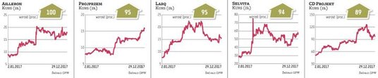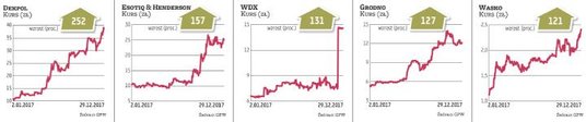 Na drugim miejscu podium znalazła się spółka Esotiq & Henderson, zajmująca się projektowaniem, produkcją i sprzedażą bielizny. Mocny wzrost notowań spowodowany był wyraźną poprawą wyników, na co wpłynęło pozbycie się działu mody, który ciążył rezultatom. Narastająco po trzech kwartałach spółka miała 5,7 mln zł skonsolidowanego zysku netto przypisanego akcjonariuszom jednostki dominującej w porównaniu z 4,2 mln zł straty rok wcześniej, przy przychodach ze sprzedaży w wysokości 119,6 mln zł w porównaniu z 101 mln zł rok wcześniej. Kilka dni temu spółka poinformowała o zwołaniu nadzwyczajnego walnego zgromadzenia, które 19 stycznia ma upoważnić zarząd do przeprowadzenia skupu akcji własnych w celu ich umorzenia. Projekt przewiduje, że odzieżowa firma skupi do 20 proc. wszystkich walorów za maksymalnie 21 mln zł (po maksymalnie 45 zł). Na ostatniej sesji 2017 r. papiery kosztowały 25,5 zł.