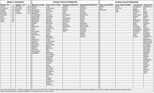 Długoterminowy złoty krzyż (skrzyżowanie średnich kroczących z 50 i 200 sesji) pojawił się na wykresach 3 spółek: Inpro, MCI i PCC Intermodal. Analogiczny krzyż śmierci widoczny jest na wykresach 4 spółek: Enei, Izolacji, KGL i Libetu. Co najmniej roczne maksima notowań wyznaczyło 19 spółek, a roczne minima aż 41 spółek. Pełne listy firm z poszczególnymi sygnałami i statystykami znajdują się w tabeli.