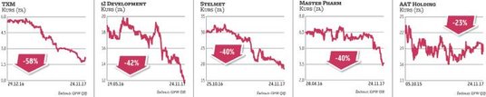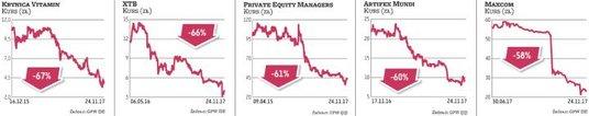 Najmocniej, aż o 67 proc., zostały od debiutu przecenione akcje spółki Krynica Vitamin zajmującej się produkcją napojów bezalkoholowych i niskoprocentowych. Spółka zadebiutowała na GPW w grudniu 2015 r. Powodem spadków mogą być niezbyt korzystne wyniki finansowe. W tym roku po dziewięciu miesiącach jej przychody wzrosły o ponad 15 proc., do 156,3 mln zł. Jednak zanotowała przy tym spadek rentowności – czysty zarobek spadł o 31 proc., do 3,7 mln zł. Na koniec września firma miała 89,7 mln krótko- i długoterminowych zobowiązań. Krynica Vitamin ma teraz kapitalizację 45 mln zł. Dzieli się zyskiem z akcjonariuszami – w 2017 r. stopa dywidendy wyniosła 2,7 proc. (0,17 zł na akcję), a rok wcześniej 6,3 proc. (0,72 zł).