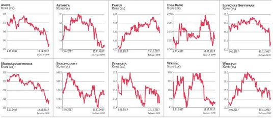 Sobiesław Kozłowski, szef działu analiz Raiffeisen Brokers, zaznacza, że dla inwestorów długoterminowych inwestycyjną okazją mogą być akcje LiveChat Software i Medicalgorithmics. – Po informacji o wejściu Facebooka na rynek, na którym działa LiveChat, akcje konkurencyjnych spółek Atlassian oraz Zendesk notowane w USA podrożały, a nie mocno potaniały jak LiveChatu. Wydaje się, że inwestorzy amerykańscy mają lepsze rozpoznanie dotyczące spółek działających w tej niszy. Dodatkowo polska firma pozycjonuje się w segmencie premium – mówi. Zaznacza, że z kolei telemedyczna spółka Medicalgorithmics pokazała nieco lepsze dane dotyczące liczby złożonych wniosków w październiku, co pozytywnie wpłynęło na kurs. – Firma ta powinna w kolejnych latach nadal rozwijać się organicznie – ocenia Kozłowski. W poniedziałek akcje spółki kosztowały 192 zł. Analitycy DM BOŚ wyceniają je na 237,5 zł. Spodziewają się, że spółka w najbliższych latach będzie dynamicznie poprawiała wyniki. W tym roku powinna zarobić 19,6 mln zł netto. W latach 2018–2019 zarobek powinien wzrosnąć do odpowiednio 32 mln zł i 43,4 mln zł. Od początku roku walory LiveChatu potaniały o blisko 30 proc., zaś Medicalgorithmics o 37 proc.