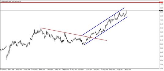 Alcoa jest jednym z największych producentów aluminium na świecie. Firma została założona w 1888 r. i od tamtego czasu przeżyła już sporo. Były lepsze i gorsze czasy. A jak jest teraz? Analiza finansowa wskazuje, że aktualnie spółka nie radzi sobie zbyt najlepiej, ale przyszłość wygląda bardziej optymistycznie. Spółka boryka się z dużym zadłużeniem i brakiem płynności. Wskaźnik gotówki do długu spadł do poziomu 0,8, co jest gorszym wynikiem od średniej z branży. Brak płynności może być zapowiedzią problemów z regulowaniem krótkoterminowych zobowiązań. Od strony wyceny wskaźnikowej notowana firma również nie wygląda atrakcyjnie. Cena do zysku ukształtowała się na poziomie 34, jest to gorszy wynik od średniej rynkowej. Co doprowadziło do tak trudnej sytuacji spółki? Nie możemy zapomnieć, że Alcoa przeżywała chwile grozy z całą branżą. Od 2011 r. notowania aluminium systematycznie spadały, zmiana nastąpiła dopiero w 2016 r. W ostateczności mocny wzrost cen aluminium powinien przyczynić się do poprawy sytuacji fundamentalnej w spółce, co już widzimy po zachowaniu cen akcji. Od początku roku spółka dała zarobić inwestorom ponad 75 proc. Dalsze paliwo do wzrostów powinno zostać zapewnione przez rosnące ceny aluminium. Notowania akcji poruszają się w kanale wzrostowym, po mocnym przebiciu przez opór 50 USD powinniśmy zobaczyć kontynuację tego ruchu w kierunku 55 USD za jedną akcję.