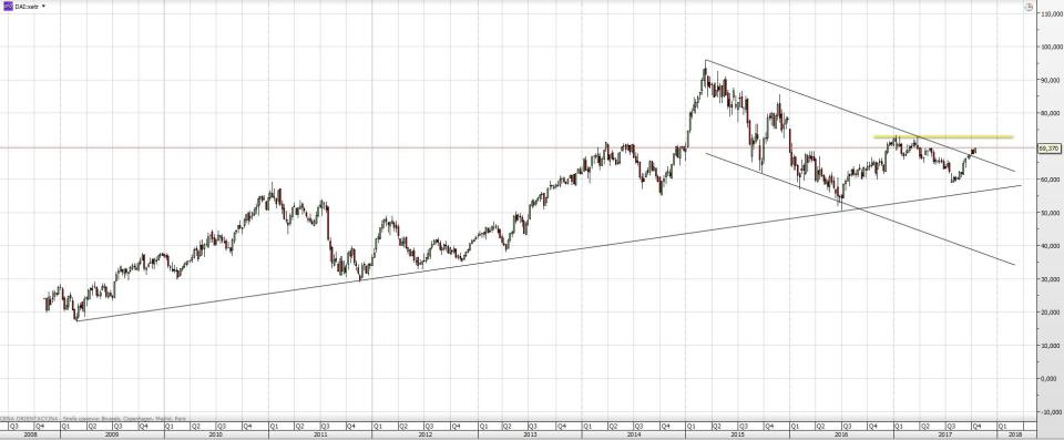 Cena akcji wyraźnie zakręciła w górę – doszło do przebicia w górę linii trendu spadkowego – jest to wstępny sygnał kupna. W nieco innym ujęciu można również zauważyć formację klina spadkowego, z którego cena stara się wybić w górę – zasięg takiego wybicia to co najmniej cena 6,37 euro. Poziomy oporu położone są na: 5,60 (niezbędne jego przełamanie do rozpoczęcia fali zwyżki), 5,78 i 6,23 euro. Z kolei zniżka ceny poniżej 5,43 miałaby negatywną wymowę z punktu widzenia analizy technicznej. Na wskaźnikach i oscylatorach dominują sygnały kupna: MACD, po formacji podwójnego dna stara się wybić w górę, potwierdzając wcześniejszy sygnał kupna na nim samym oraz na RSI, ROC. W układzie średnich ruchomych 13- i 45-sesyjnych maleje odległość między średnimi, co powinno wkrótce doprowadzić do wygenerowania sygnału kupna. Wskaźniki wolumenowe sygnalizują „przeciąganie liny" między popytem a podażą z lekką przewaga popytu.