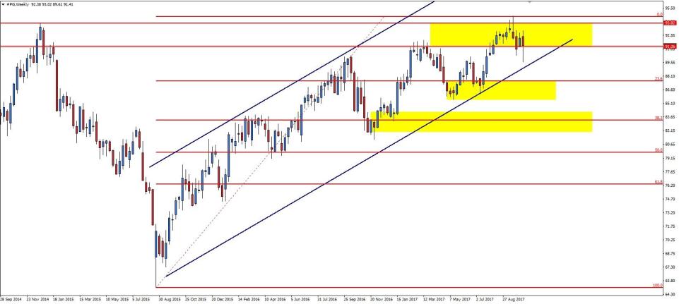 Przez ostatnie lata, akcje P&G dostarczały inwestorom dodatnie stopy zwrotu. Kurs znajduje się w trendzie wzrostowym, jednak po przetestowaniu szczytów z grudnia 2014 r. nastąpił delikatny odwrót. Pytanie: co dalej? Walka na szczycie jeszcze potrwa, a inwestorzy na razie zaufali obecnemu zarządowi, który twierdzi, że w spółce dokonywane są już zmiany, które zapewnią dalsze wzrosty. Wybicie dołem linii trendu wzrostowego oraz poziomu 90 dol., może spowodować spadki w okolice 87 dol. Celem rynku mogą być jednak dołki z listopada 2016 r., czyli poziomy 82 - 83 dol. za akcję. Dalsze wzrosty zapewni trwałe wybicie oporu na poziomie 94 dol.