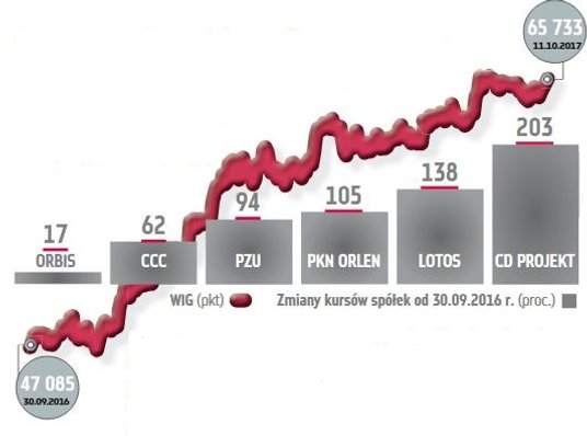 Indeks szerokiego rynku WIG rósł podczas środowej sesji nawet do 65 802 pkt. Jest to nowy szczyt trwającej od roku hossy i jednocześnie najwyższy poziom od ponad dekady. Do historycznego maksimum WIG brakuje już tylko 3,2 proc. – W ostatnich dniach obserwujemy odbicie indeksu MSCI Emerging Markets, który przebił właśnie ostatni, wrześniowy, szczyt. Jest to sygnał utrzymania trendu wzrostowego i dobrego nastawienia inwestorów do rynków rozwijających się. Korzysta na tym WIG20, a w ślad za nim szeroki WIG. Dobra koniunktura gospodarcza powinna wspierać wzrost rynków akcji do końca roku, dlatego oczekujemy, że WIG przebije swoje historyczne maksimum – mówi Michał Krajczewski, analityk BM BGŻ BNP Paribas. Pobicie rekordu wydaje się bardzo realne w obliczu siły największych 20 spółek, którego stanowią aż 75 proc. portfela WIG. W środę WIG20 rósł już piątą sesję z rzędu i naruszył tegoroczny szczyt. Segment blue chips napędzają m.in. spółki paliwowe. Kursy akcji PKN Orlen i Lotosu wyznaczyły w ostatnich dniach historyczne maksima. Rekordy pobiły też PZU i CCC. Do tego dochodzi sektor bankowy, który po chwili przestoju znów wraca do łask inwestorów. Świadczy o tym zwyżka WIG-banki o 3,4 proc. w ciągu ostatnich trzech dni. Warto dodać, że statystycznie IV kwartał jest okresem najbardziej udanym w wykonaniu blue chips. WIG20 rośnie w tym okresie średnio o 3,6 proc.