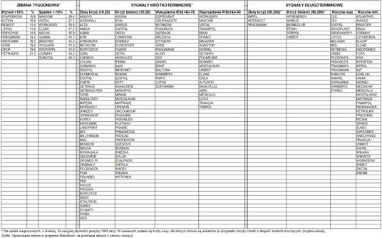 Krótkoterminowa formacja złotego krzyża (średnia krocząca z 10 sesji przebiła od dołu 20-sesyjną) pojawiła się na wykresach 49 spółek (o 4 więcej niż przed tygodniem), w tym m. in. Amiki, Banku Handlowego i PCC Rokity. Analogiczny krzyż śmierci pojawił się na wykresach 40 spółek (o 7 więcej niż przed tygodniem), w tym m. in. Agory, mBanku i Quercusa.