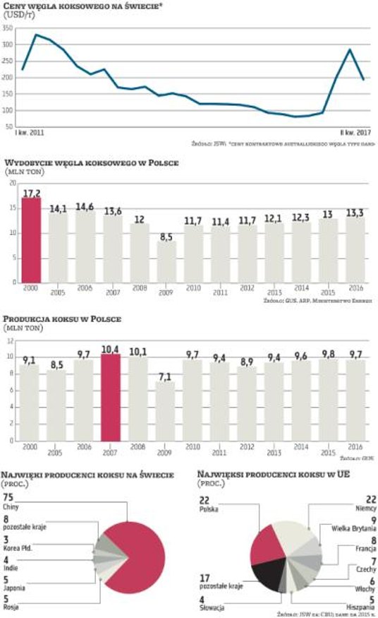 Żeby się przekonać, jak trudna była sytuacja koksowni na początku 2017 r., wystarczy spojrzeć na wyniki Jastrzębskiej Spółki Węglowej. W I kwartale na sprzedaży koksu spółka zanotowała 71,5 mln zł straty operacyjnej. Na czerwono zaświeciła się także EBITDA (wynik operacyjny powiększony o amortyzację) tego segmentu, która wyniosła minus 48,2 mln zł. Dla porównania, w tym samym czasie segment węglowy przyniósł JSW 1,14 mld zł zysku operacyjnego oraz 1,3 mld zł EBITDA. Wszystko przez to, że wzrost cen węgla koksowego nie przeniósł się w tym samym stopniu na wzrost cen wytwarzanego z tego surowca koksu. Benchmark dla cen węgla koksowego wzrósł o 162,5 proc. w porównaniu z takim samym okresem ubiegłego roku, natomiast koks podrożał w tym czasie jedynie o 80,5 proc.