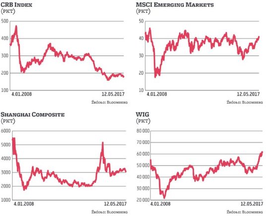 Druga połowa minionego tygodnia przyniosła niewielkie odreagowanie trwającej od początku roku spadkowej tendencji CRB Index. Wskaźnik koniunktury rynku surowcowego kilka dni wcześniej przetestował dołek z sierpnia ubiegłego roku. Na razie można powiedzieć, że utrzymał się w granicach konsolidacji, w której przebywa od 12 miesięcy. Od dna bessy z początku 2016 r. dzieli go bezpieczny, 16-proc. dystans i powrót w jego okolice raczej mu nie grozi, ale to niewielkie pocieszenie, jeśli wziąć pod uwagę, że wciąż znajduje się na poziomie sprzed 15 lat. Za sukces można by uznać dotarcie CRB do górnego ograniczenia wspomnianej konsolidacji, co oznaczałoby wzrost o około 8 proc. Do realizacji takiego scenariusza konieczna byłaby znacząca zwyżka notowań ropy naftowej i miedzi. Szanse na to są zróżnicowane i niezbyt pewne. W miniony czwartek pojawiła się informacja o osiągnięciu przez przedstawicieli OPEC i krajów spoza tej organizacji porozumienia w sprawie przedłużenia terminu obowiązywania limitów wydobycia ropy na kolejne pół roku. Ostateczna decyzja w tej sprawie ma zapaść 25 maja, jednak już teraz można sądzić, że zostanie podjęta bez problemu. Problem w tym, czy to wystarczy, by wywołać pożądany efekt, czyli wzrost cen surowca. Na razie euforii na rynku nie widać. Notowania WTI od dołka ustanowionego w pierwszych dniach maja poszły w górę o 5 proc. i zatrzymały się w czwartek poniżej 48 dolarów za baryłkę. Wcześniejsze spekulacje zakładały, że utrzymanie ograniczeń w wydobyciu mogłoby skutkować powrotem notowań surowca w okolice 55 dolarów. Oznaczałoby to wzrost o prawie 15 proc. od obecnego poziomu. Poprzednia fala wzrostowa z marca i kwietnia wyniosła cenę w górę o ponad 12 proc., do nieco ponad 53 dolarów za baryłkę. Wcześniej, od listopada do grudnia ubiegłego roku, notowania wzrosły o 25 proc., docierając do niecałych 54 dolarów. W ciągu pierwszych niespełna pięciu miesięcy obowiązywania ograniczenia produkcji notowania WTI i Brent zniżkowały po 15 proc. Można więc mieć wątpliwości, czy kolejne miesiące przyniosą przełom. Na przeszkodzie stoją wciąż potężne zapasy surowca, zwiększające się wydobycie z amerykańskich złóż łupkowych oraz niemrawy wzrost popytu. W takiej sytuacji na pewien skutek można by liczyć w przypadku jeszcze większej niż do tej pory redukcji wydobycia w ramach porozumienia. Nie wiadomo jednak, czy na takie posunięcie zdecydują się główni producenci i czy byłaby ona przestrzegana.