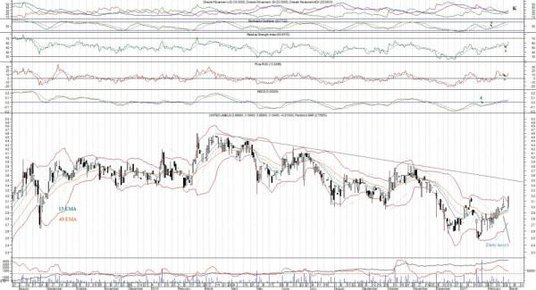 Cena akcji wyraźnie stara się wybić w górę – musi dojść do przebicia poziomu oporu na 3,17 euro, co otworzy drogę wyżej, ku nowym szczytom (3,83 i 4,25 euro). Linia trendu spadkowego usytuowana jest na poziomie 3,50 euro (to pierwszy poważny opór, o ile nie najpoważniejszy opór). Optymistycznie prezentuje się formacja złotego krzyża na średnich 13- i 45-sesyjnych, zapowiadająca ruch w górę. Podobne wskazania płyną od wskaźników i oscylatorów, na których dominują wskazania kupna. MACD przełamał poziom 0 i zwyżkuje, zbliżając się do oporu od dwu poprzednich swoich szczytów. Z kolei RSI utworzył nowe maksimum – potwierdzając tym samym zwyżkę ceny waloru. Wskaźnik Akumulacja/Dystrybucja uwidacznia napływ środków od października.