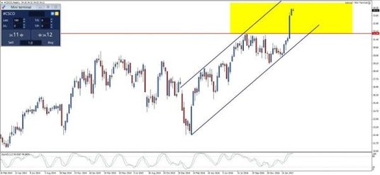Cisco, gigant na rynku teleinformatycznym, to jedna z tych spółek, które radzą sobie bardzo dobrze w ostatnim czasie. Od początku 2016 r. dała zarobić inwestorom ponad 47 proc., a w samym 2017 r., ponad 12 proc. Po ogłoszeniu wyników kwartalnych, cena akcji wystrzeliła w górę, przebijając kluczowy opór na poziomie 32 USD i osiągając najwyższy poziom od listopada 2007 r. - 34,31 USD. Czy spółka ma potencjał do dalszych wzrostów? Kwartalne wyniki pokazały spadek przychodów i zysku, ale i tak okazały się lepsze od oczekiwań analityków. Cisco zapowiedziało również wzrost wypłacanej dywidendy co przekłada się na większe zainteresowanie spółką ze strony funduszy dywidendowych. Firma wypada też nieźle na tle konkurencji, jeżeli chodzi o dane finansowe. Marża netto na poziomie 20 proc. jest zdecydowanie wyższa niż średnia branży (2 proc.). Cisco może się również pochwalić solidnym ROE (15,65 proc. vs 3,8 proc. dla branży), ROA (8,12 proc. vs 2 proc. dla branży) oraz niższym od konkurentów wskaźnikiem ceny do zysku 17,62. Co jeszcze przemawia za Cisco? Bezpieczeństwo sieciowe to w obecnych czasach bardzo poważny temat, a doświadczenie oraz infrastruktura dają spółce sporą przewagę nad konkurencją. W lutym, firma zawarła umowy z takimi gigantami rynku jak Saudi Telecom, Vodafone Germany oraz z indyjskim Reliance Jio. Jakie jest ryzyko związane z akcjami Cisco? Korekta indeksów amerykańskich, która może nastąpić jednocześnie pociągając w dół kursy największych spółek.