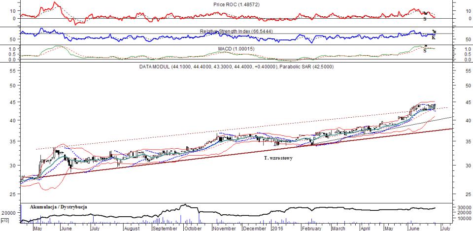 Z kolei spadek poniżej przesuniętej w górę linii trendu wzrostowego (dzisiaj poziom 42,60 euro, byłoby sygnałem pogorszenia koniunktury. Sygnały na wskaźnikach i oscylatorach nie są jednomyślne - przeplatają się wskazania kupna i sprzedaży - MACD jest już dość mocno wykupiony. Wskaźnik Akumulacja / Dystrybucja lekko zakręcił w górę (widoczny przypływ środków na rynek tego waloru).