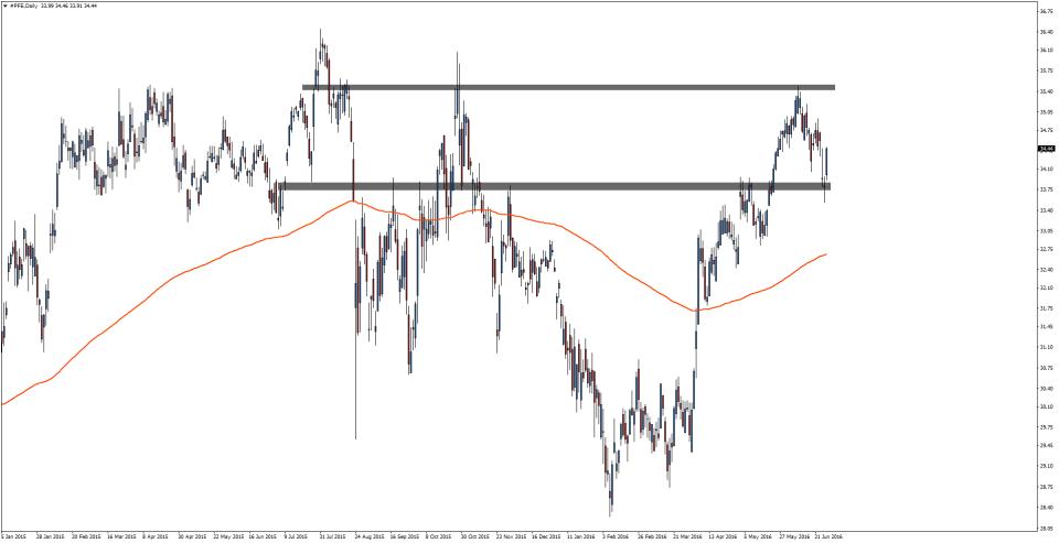 Dzisiejsza propozycja to Wells Fargo. Od połowy 2015 roku mamy tutaj dominujący trend spadkowy przedzielony dwiema technicznymi korektami ubranymi w klina. Na początku czerwca doszło do wyjścia z klina dołem, co w teorii powinno rozpocząć nową falę spadków. Widzimy jednak, że odbiliśmy się od ważnego długoterminowego wsparcia w postaci 38,2% Fibonacciego. Ze względu na to, że może to być zaczątek kolejnej korekty to nie chcemy otwierać tutaj pozycji 'z ręki'. Proponujemy natomiast otworzenie zlecenia oczekującego sell stop, poniżej minimów z tego tygodnia.