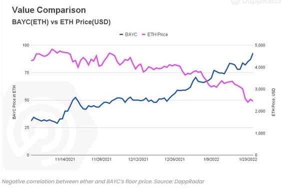 Teoria 1: NFT wyceniane są wyżej, gdy spada eter. Większość transakcji NFT jest denominowana w eterze, co oznacza, że wykazują oznaki negatywnej korelacji z ceną krypto. Tak więc trend, który obserwujemy, polega na tym, że gdy wartość eteru spada, NFT – zwłaszcza NFT blue chipów – wyceniane są wyżej, aby dopasować wartość w dolarach przed spadkiem. Cena minimalna BAYC w rzeczywistości wzrosła o 14 proc. w przeliczeniu na dolary podczas ostatniej bessy na rynku kryptowalut, więc kolekcja stała się w pewien sposób unikalną klasą aktywów, która przechowuje wartość w swojej – co prawda bardzo krótkiej – historii. Co ciekawe, ceny NFT (w eterze) nie spadają, gdy cena eteru rośnie. Ponownie, nikt tak naprawdę nie może powiedzieć dlaczego, ale być może ma to coś wspólnego z szybkością: spadki są często szybkie, podczas gdy wzrosty cen są powolne i stabilne. Cykl przebiega więc mniej więcej tak: kolekcja NFT jest wprowadzana na rynek i rozrasta się w czasie, ustalając swoją minimalną cenę. Eter spada mocno i szybko. Cena minimalna NFT rośnie w przeliczeniu na eter w reakcji na spadek. Rynek przyzwyczaja się do nowego poziomu. Ceny eteru z czasem stale rosną, a kolekcja NFT nadal jest sprzedawana po wyższej cenie minimalnej eteru.