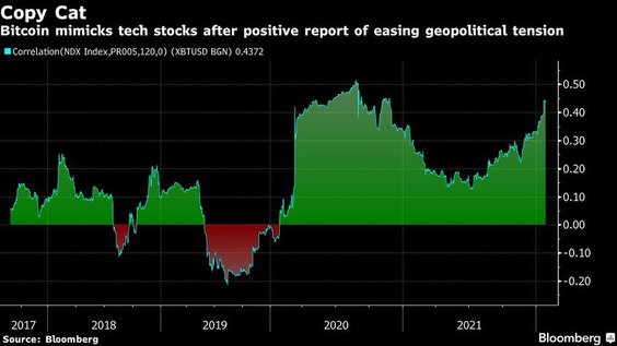 Bitcoin został dotknięty niepokojami rynku o Ukrainę, spadając w piątek o 2,7%. Zwolennicy aktywów cyfrowych często zachwalają nieskorelowane relacje z szerszymi rynkami, jednak klasa aktywów nadal naśladuje ruchy akcji, w szczególności spółek technologicznych. Współczynnik korelacji między kontraktami terminowymi Nasdaq 100 a bitcoinem wynosi obecnie 0,4, przy czym 1 oznacza ruchy równoległe.