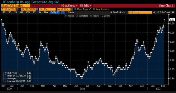 Indeks Markit CDX North American Investment Grade Index, koszyk swapów ryzyka kredytowego, który służy jako miernik ryzyka kredytowego, rozszerzył się w tym roku o ponad 17 punktów bazowych do 64 punktów, co jest najwyższym poziomem od września 2020 roku.