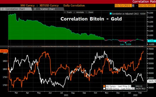 Cena Bitcoina spadła o 5 proc. w ciągu 24 godzin, osiągając 37 273 USD, po czym zeszła poniżej 37 tys. Złoto poszło w drugą stronę. Bullion odnotował w ciągu nocy kolejny wzrost o 0,4 proc., dochodząc do 1 910 USD za uncję trojańską. To najwyższa cena złota od sierpnia 2020 roku. Złoto – i akcje złota ASX – czerpią korzyści z rosnącej niepewności geopolitycznej i spadają, gdy ta niepewność się zmniejsza. Cena Bitcoina ma natomiast tendencję do silnego spadku, gdy inwestorzy chcą zaparkować więcej swoich pieniędzy w aktywach postrzeganych jako schronienie. Korelacja między cyfrowym i analogowym złotem jest teraz nawet ujemna.