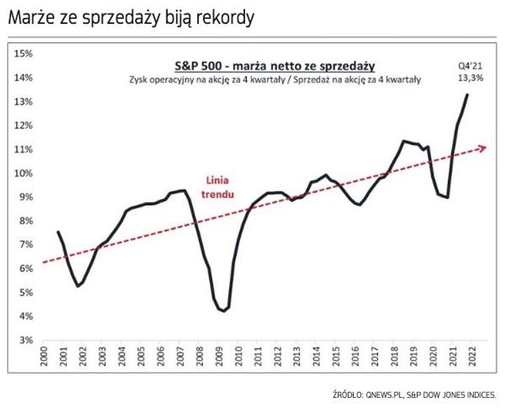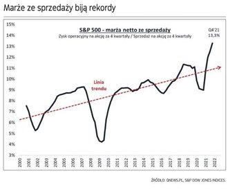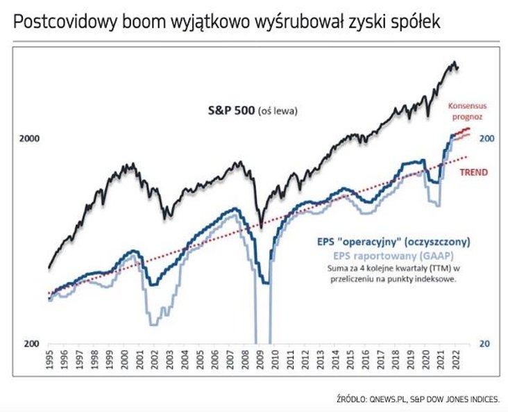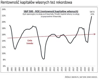Trzeba przyznać, że spółki z S&P 500 mają się czym pochwalić. IV kwartał 2021 r. wydłużył serię spektakularnej poprawy wyników finansowych, trwającą od I kwartału ub.r. W efekcie EPS, czyli zysk na akcję (liczony za cztery kolejne kwartały – więcej o metodologii w ramce), w samym IV kwartale podskoczył (kwartał do kwartału) o prawie 10 proc., a w całym ubiegłym roku – o 70 proc.