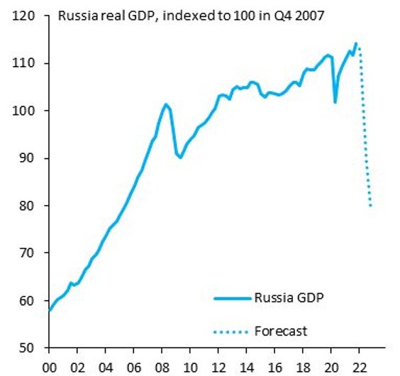 Według Banku Światowego w 2020 roku Rosja była 11. co do wielkości gospodarką świata. Ale Według Jima O'Neilla, byłego ekonomisty Goldman Sachs, który ukuł akronim BRIC, aby opisać cztery wielkie gospodarki wschodzące Brazylia, Rosja, Indie i Chiny, do końca tego roku może zajmować nie wyższą pozycję niż 15, w oparciu o kurs rubla z końca lutego.