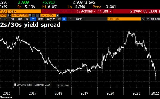 Ryzyko głębszego odwrócenia krzywej 2s/10s pojawia się, gdy spread dla odpowiednika między 5-latkami i 30-letnimi stopami również na krótko skurczył się do zaledwie minus 15,8 punktów bazowych w ciągu nocy.