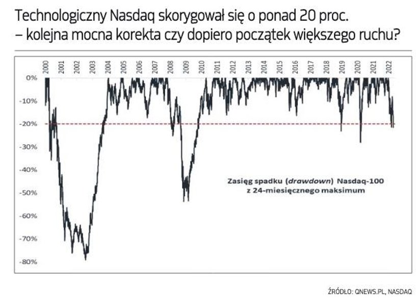 Ostatni tydzień kwietnia przyniósł wymowny sygnał w segmencie spółek technologicznych na Wall Street. Indeks Nasdaq 100, znany z korporacji-gigantów, takich jak Apple, Microsoft, Amazon, Tesla czy Alphabet, zaliczył przeszło 20-proc. spadek od szczytu hossy (odnotowanego w końcówce grudnia ub.r.). Według popularnego, medialnego kryterium oznacza to przekroczenie formalnego progu bessy. Natomiast fakty historyczne prowadzą do konkluzji, że „na dwoje babka wróżyła" – ani nie gwarantują nadejścia wielomiesięcznego rynku niedźwiedzia (w ostatnich dwóch przypadkach Nasdaq powiększył skalę przeceny maksymalnie do -28 proc. i -23 proc.), ani też nie gwarantują, że jest to już superokazja do zakupów (patrz: bessy z lat 2008 i 2000–2002). Wskazana jest chyba ostrożność, bo wyśrubowanym wycenom spółek technologicznych nie służą choćby wyższe stopy procentowe.