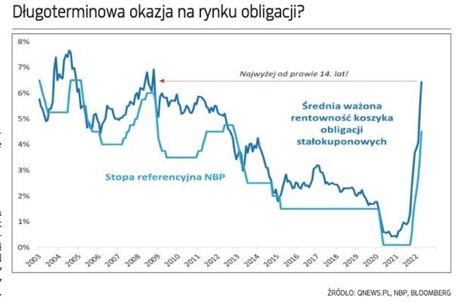 Kwiecień przyniósł kontynuację trendu wzrostowego rentowności obligacji skarbowych pod wpływem oczekiwań na dalsze podwyżki stóp. Średnia ważona rentowność papierów stałokuponowych podawana przez Bloomberga zawędrowała powyżej 6 proc. w skali roku – do poziomu najwyższego od... prawie 14 lat. Można zakładać, że obligacje będą coraz bardziej łakomym kąskiem dla wytrawnych inwestorów, szczególnie że banki komercyjne nie spieszą się z podnoszeniem oprocentowania depozytów.
