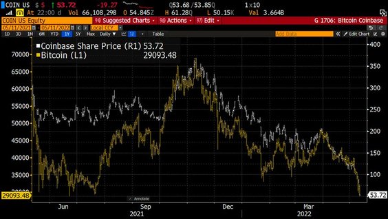 Platforma handlowa kryptowalut Coinbase straciła połowę swojej wartości w zeszłym tygodniu, notując największy jednodniowy spadek w historii w środę, gdy niestabilny rynek kryptowalut przeżywa kolejny spadek.