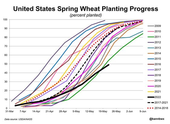 Służba statystyczna Departamentu Rolnictwa Stanów Zjednoczonych (NASS) co tydzień publikuje krajowe raporty o postępach w uprawach od kwietnia do listopada. Szacunki postępu upraw są pobierane od lokalnych ekspertów w dziedzinie rolnictwa, głównie agentów ds. rozszerzenia hrabstw, z celem co najmniej jednego raportu z każdego hrabstwa. Respondenci dokonują subiektywnych ocen na podstawie tego, co widzą i słyszą, i szacują tygodniowy postęp w sadzeniu w hrabstwie na podstawie założeń zamiarów nasadzenia w danym dniu. Odsetek ten nie pochodzi z marcowego raportu NASS, który podaje oczekiwane nasadzenia na poziomie stanowym i krajowym, a nie powiatowym. Na przykład, jeśli respondent usłyszy, że wielu lokalnych rolników zrezygnowało z kukurydzy w ciągu jednego tygodnia i zdecydowało się sadzić soję lub zamiast tego przyjąć płatności za zapobieganie sadzeniu, uwzględni to w swojej ocenie ogólnego postępu sadzenia. W ten sposób stan mógłby poczynić znaczne postępy w sadzeniu w ciągu tygodnia bez jednego plantatora, który wyszedłby na pole. Może tak nie było w ostatnim tygodniu, ponieważ większość Dakoty Północnej ma ostateczny termin sadzenia kukurydzy 25 maja, 31 maja lub 5 czerwca dla pszenicy jarej i 10 czerwca dla soi. Środkowa i południowa Minnesota ma czas do 31 maja na kukurydzę.